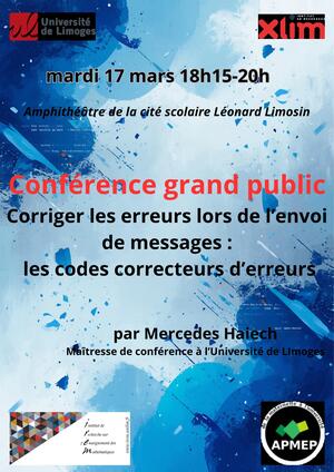 À Limoges, mardi 17 mars et mercredi 25 mars 2026, dans l’auditorium de la cité scolaire Léonard-Limosin, auront lieu 2 conférences de mathématiques, soutenues par la Régionale de Limoges.