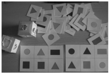 - 6 plaquettes avec six figures différentes (soit par la forme – carré, rectangle, triangle et rond –, soit par la couleur) sur chacune d’elles,