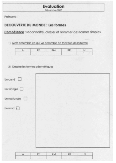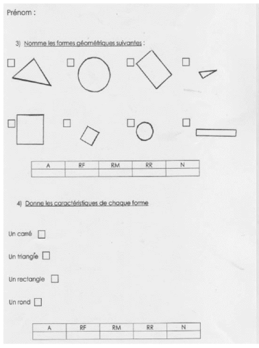 Dans un second temps, je posais des questions à chaque élève. Il devait nommer les formes dessinées sur sa feuille individuelle d’évaluation, dessiner les formes que je lui demandais et, enfin, me donner les caractéristiques de chaque forme, c’est-à-dire ce sur quoi il s’appuyait pour les reconnaître.