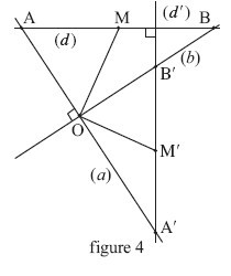$O$ transformant $[OA’]$ en $[OB]$. Elle transformera la droite $(a)$ en la droite $(b)$ et la droite $(d’)$ en la droite $(d)$, donc le point $B’$ en le point $A$, le segment $[A’B’]$ en $[BA]$ et le milieu $M’$ en le milieu $M$, et donc la droite $(OM’)$ en une droite perpendiculaire $(OM)$.