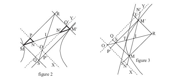 Soient $M$ et $M’$ deux points distincts d’une hyperbole équilatère de centre $O$ et d’asymptotes $(OX)$ et $(OY)$. Nous avons fait deux figures, selon que $M$ et $M’$ sont sur la même branche ou sur des branches distinctes de l’hyperbole (figures 2 et 3). La droite $(MM’)$ coupe les asymptotes en $N$ et $N’$ respectivement. Soient $P$ et $Q$ les