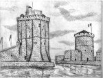 Patrice Jeener présentait ses gravures aux Journées à La Rochelle. À cette occasion, il a réalisé cette vue des deux Tours du Vieux Port :
