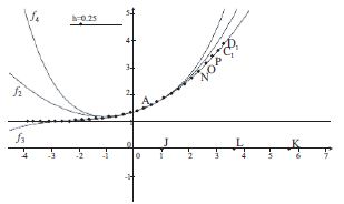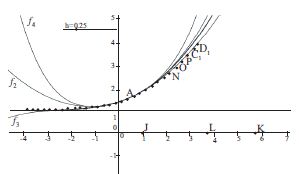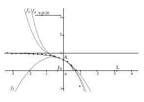 Voici le tracé sur la même figure des représentations graphiques de $f_2, \ f_3, \ f_4$ ; on remarque qu’elles s’écartent nettement l’une de l’autre, et des points obtenus par la méthode d’Euler, quand on s’éloigne de A (fig. 4)
