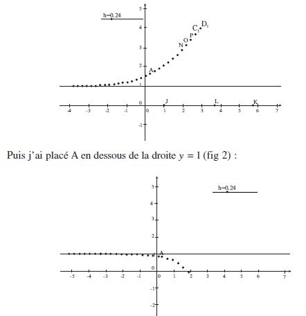 Puis j’ai créé un Outil, que j’ai appelé EulerDroite, avec comme objets initiaux h et A, objets finaux y’ et B. Pour pouvoir obtenir sur la même figure des points à gauche de A, j’ai créé C = A + (−h,−h * y’), et l’outil EulerGauche [2] : objets initiaux h et A, objets finaux y’ et C. J’ai appliqué EulerDroite à A, puis au point obtenu, ainsi de suite une quinzaine de fois ; j’ai fait de même avec EulerGauche, j’ai caché les noms des points, et ajouté la droite y = 1 représentant la solution particulière ; voici ce qu’on obtient (fig. 1) :