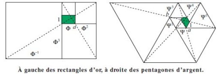 La « figure d’argent » ci-dessus à droite, est obtenue ainsi : on part d’un pentagone particulier (celui hachuré où apparaît $\omega$) puisqu’il a quatre angles de 120° et un de 60° tandis que ses côtés, dans l’ordre approprié aux angles, sont proportionnels à $\Psi, \Psi^2, \Psi^3, \Psi^4, \Psi^5$.