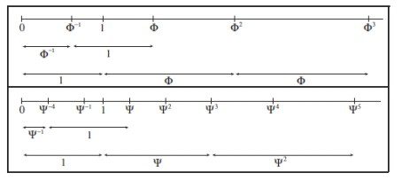 Si l’on considère cette échelle pour mesurer des longueurs de segments, deux conditions de compatibilité sur ce système doivent être satisfaites. Tout d’abord. en juxtaposant deux segments de mesure consécutive $q^k$ et $q^{k+1}$, on obtient un nouveau segment dont la mesure est un certain $q^m$ (m = k + 2 avec q=$\Phi$ ou m = k + 3 avec q= $\Psi$). D’autre part en superposant deux segments de mesure $q^{k-1}$ et $q^{k}$ on obtient un nouveau segment « différence ». dont la mesure doit être un certain $q^n$. On voit ainsi que cela se ramène, par équivalences à trouver x > 1 tel que $\left\{\begin{array}{rcl} x+1=x^k\\ x-1=x^{-l}\\\end{array}\right$