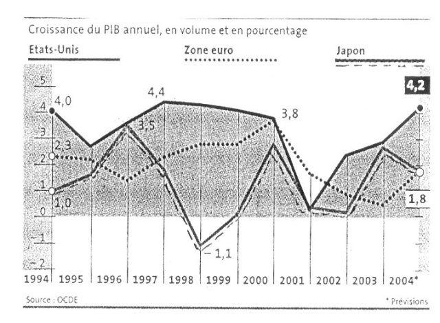 3) Déduire du tableau le taux d’évolution entre 1994 et 2004 du PIB annuel de chacun des cas étudiés ( Etats Unis , zone euro et Japon )