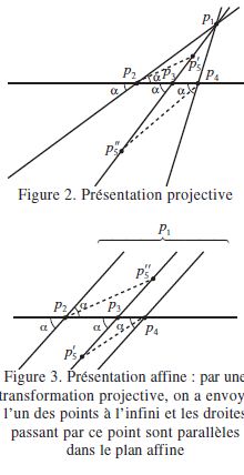 - On peut également utiliser les transformations du plan projectif : par exemple, envoyer l’un des points à l’infini, les droites qui passent par ce point deviendront des parallèles dans le plan affine.