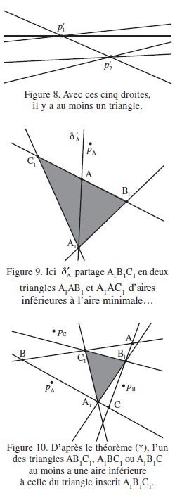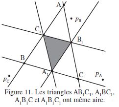 Les trois triangles voisins du triangle $A_1B_1C_1$ ainsi déterminés, $AB_1C_1, A_1BC_1, A_1B_1C$, construits à partir de droites de $\Delta$’ doivent avoir une aire au moins égale à celle du triangle $A_1B_1C_1$ (voir la figure 10) :