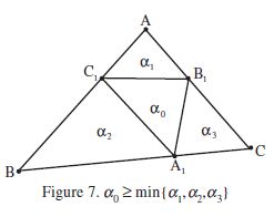 Alors l’aire $\alpha_0$ du triangle $A_1B_1C_1$ inscrit est supérieure ou égale au minimum des aires $\alpha_1, \alpha_2, \alpha_3$ des trois triangles respectifs $AB_1C_1, BC_1A_1$ et $CA_1B_1$. De plus, il n’y a égalité que lorsque $A_1, B_1, C_1$ sont les milieux $A_0, B_0, C_0$ des côtés respectifs [BC], [AC] et [AB] du triangle ABC. Dans ce cas on $\alpha_0 = \alpha_1 = \alpha_2 = \alpha_3$. [6]