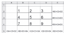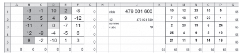 Sur cette copie d’écran les contraintes de symétrie n’apparaissent pas. Il y a douze sommes comme : « =B1 + F5 »