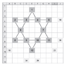 Réorganiser l’étoile afin que la somme des quatre nombres de chacune des six lignes soit toujours la même.
