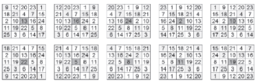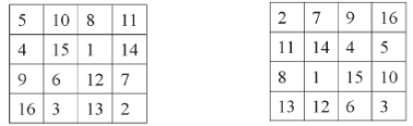 Carrés multi-magiques obtenus en ajoutant quelques contraintes (la somme de quatre cellules adjacentes égale 34).