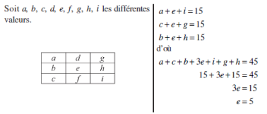 À ce stade, les élèves semblent persuadés que dans un carré magique d’ordre 3 de constante magique 15, la case centrale vaut 5. Un calcul littéral permet de le démontrer.