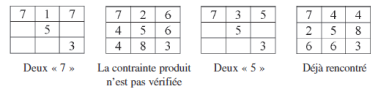 Ce produit impose un 5 et un 7 uniques. Comme le 5 est au centre, il suffit de regarder les grilles possibles, de les compléter et d’éliminer les grilles présentant une contradiction. Il n’y a que deux configurations possibles : le 7 est dans un coin ou sur un bord. La seconde aboutit, pas la première. C’est assez rapide et le recours au calcul littéral n’est pas nécessaire. L’ordinateur est éteint. On travaille au tableau, les élèves venant à tour de rôle compléter les différentes grilles en s’arrêtant à la première anomalie.
