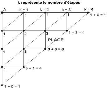 mènent à chaque point de la plage en partant d’un point donné (le sommet A du triangle) en ayant le choix entre deux directions (on peut imaginer que l’on joue à
