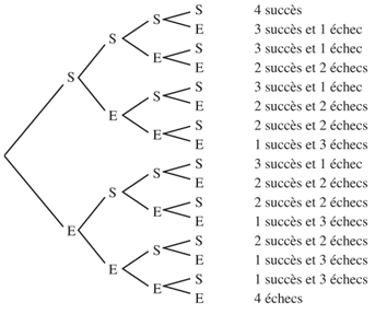 quatre chemins pour 3 succès et 1 échec donc $\begin{pmatrix}4 \\3\end{pmatrix}=4$ ;