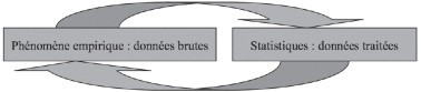 Les statistiques constituent le modèle mathématique de traitement de l’information, et cette modélisation présente là encore un aller-retour entre le monde « réel » et le monde mathématique comme l’illustre le schéma ci-dessus.
