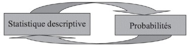 La statistique descriptive est une première mathématisation et donc une première abstraction du monde. Les probabilités vont offrir une modélisation de cette « réalité abstraite » intégrant et mathématisant une dimension fondamentale du monde de l’incertitude : le hasard. Le schéma ci-dessous traduit ce passage des statistiques aux probabilités, appelées statistiques « inférentielles » ou « inductives ».