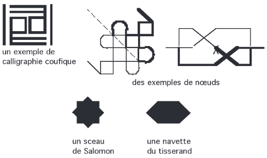 3) De la géométrie : Cette partie commence souvent par la recherche du « motif minimal » dans des mosaïques ou des jalousies existantes. Le professeur d’Arabe faisant une large place à la calligraphie, la reprise en mathématiques de la calligraphie coufique [5] permet d’aborder les symétries, au programme en Sixième et en Cinquième ; les noeuds, motifs traditionnels de l’art arabo-musulman, permettent de revoir rapidement toutes les propriétés de conservation de ces transformations du plan.