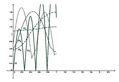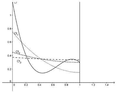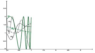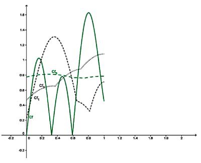 trois ou quatre fois à partir d’une courbe initiale C(f) en trait vert plein, le dernier état