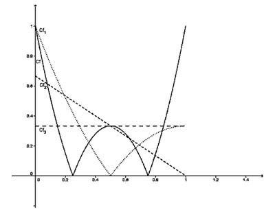 en trois itérations : $f(x) = \left|\frac {(4x-1)(4x-3)}{2}\right|$. On remarquera que ce résultat (segment horizontal en trois coups) n’est plus vrai hors de l’intervalle [0 ; 1].