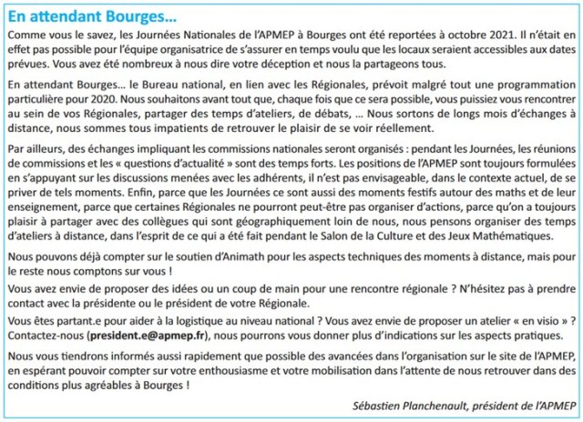 Les quatre premiers jours des vacances d’automne sont habituellement synonymes, pour beaucoup d’entre nous, de rencontres et de découvertes autour des mathématiques lors des Journées Nationales de l’APMEP. Cela nous aurait fait du bien de nous retrouver, même masqué.e.s, à Bourges. Mais les conditions sanitaires si particulières de cette année 2020 nous ont forcé.e.s à repousser à octobre 2021 ces Journées Nationales au cœur de la France.