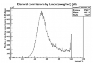 Pour chaque élection, on peut tracer une courbe. En abscisse un pourcentage de participation [3] et en ordonnée le nombre de bureaux de vote qui ont enregistré ce pourcentage.