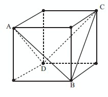 Soit les points $A$(1,1,1), $B$(−1,1,-1), $C$(−1,−1,1) et $D$(1,−1,−1) dans un repère orthonormé $(O,x,y,z)$ : ce sont quatre sommets d’un cube comme représenté ci-contre.