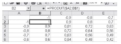 Dans un tableur, indiquer en première ligne à partir de la cellule B1, puis en première colonne à partir de la cellule A2, les réels de $−1$ à $1$ avec un pas de $0,1$.