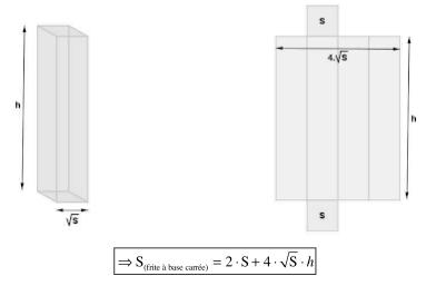- l’aire totale d’une frite à base carrée d’aire S et de hauteur h données vaut :
