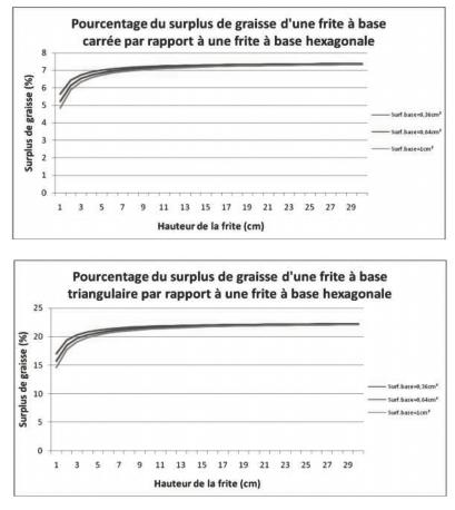 Les graphiques ci-joints représentent le pourcentage du surplus de graisse d’une frite à base triangulaire ou carrée par rapport à une frite à base hexagonale en fonction de la hauteur et selon le type de frites :