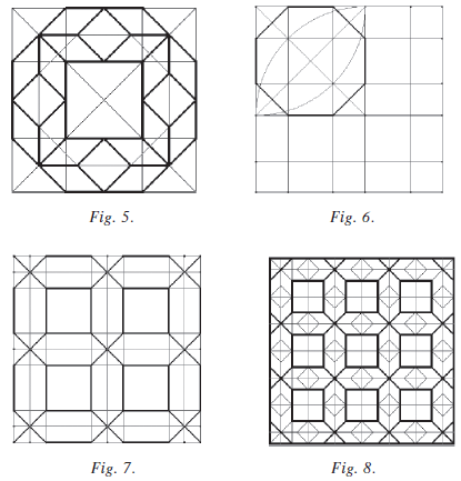 L’observation y fait apparaître des octogones réguliers sécants (fig. 3). Ceci pose le problème de l’inscription d’un octogone régulier dans un carré, construction basée sur le schéma-clé de la fig. 4 (le point crucial est l’intersection des quarts de cercle avec les diagonales [8]). Ce schéma-clé se complète ensuite aisément pour fournir le motif de base (fig. 5).