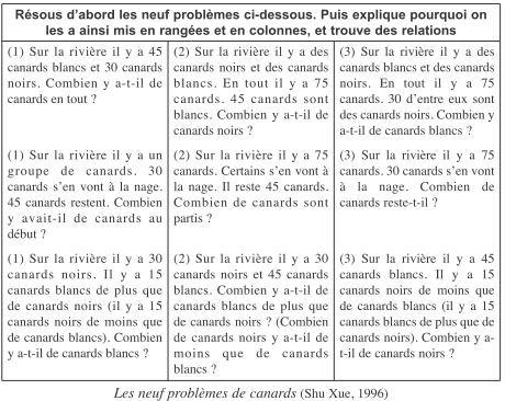 C’est peut-être vrai, mais l’attitude est différente : au lieu d’analyser et de classer les problèmes (attitude typiquement occidentale), les problèmes chinois ci-dessus sont considérés comme un tout par les enseignants et sont discutés ensemble par les élèves de CE1. C’est de cette façon qu’ils apparaissent dans les manuels.