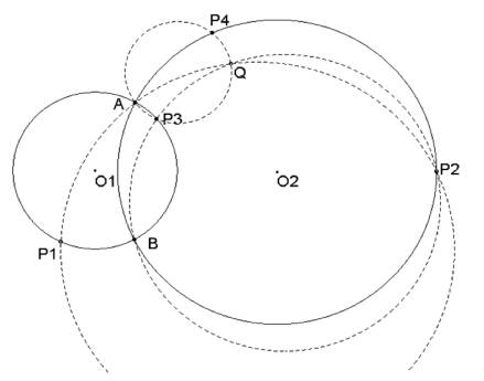 Soit, dans un plan, deux cercles $\mathcal{C_1}$ et $\mathcal{C_2}$ de centre $O_1$ et $O_2$. Les cercles $\mathcal{C_1}$ et $\mathcal{C_2}$ sont sécants en A et B. Soit Q un point du plan, non situé sur l’un des deux cercles. À un point $P_1$
