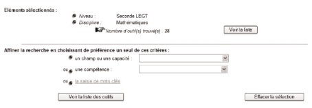 La recherche réalisée fournit 28 outils, qu’il suffit de lister (titres et résumés, fichiers multimédias, fichiers PDF). On peut aussi affiner les recherches, par champ ou capacité, compétences ou mots clés.