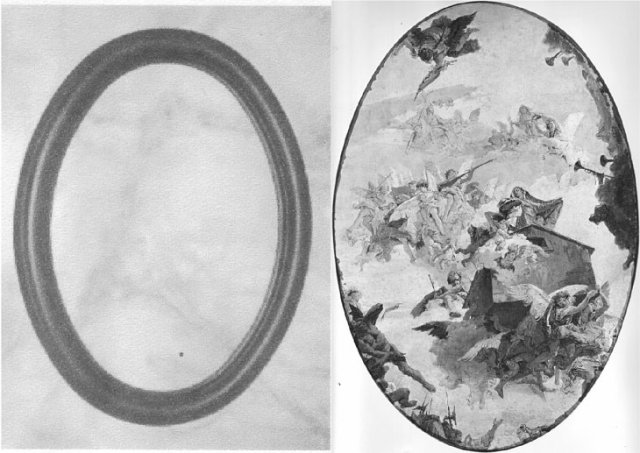 Rien ne ressemble autant à une ellipse que les formes ovales qu’utilisent les encadreurs ou les peintres (fig. 1), mais aussi les jardiniers, les architectes, les maçons, les ferblantiers et bien d’autres corps de métier. Or dans la plupart des cas ces ovales sont construits comme raccordement de quatre arcs de cercle, symétriques deux à deux et raccordés en quatre points où ces arcs ont une tangente commune. Bien malin celui qui pourra dire à l’œil nu où se trouvent exactement ces points de raccordement sur le cadre ou l’esquisse vénitienne de la figure 1. Pour de tels ovales on parle aussi de courbe en anse de panier, surtout lorsqu’il s’agit du demi-ovale. Certes cela peut y faire penser mais est totalement incorrect : une baguette d’osier que l’on courbe pour en faire une anse ne prend pas du tout cette forme géométrique (voir pour cela les courbes splines).