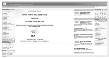 J’ai trouvé une réponse partielle à l’aide d’Ovidentia (logiciel libre développé par la société Cantico), plateforme de travail collaboratif. Nouvellement nommé l’an passé au lycée Maurois à Elbeuf (Haute-Normandie), Dominique Jouet, professeur d’économie-gestion présente Ovidentia à l’ensemble des collègues. Les fonctionnalités sont multiples : après identification à l’aide d’un mot de passe personnel, chaque élève ou professeur accède (suivant ses droits) à la possibilité d’écrire un article, de déposer des fichiers, …