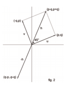un vecteur $\vec u$ de coordonnées (p,q), le vecteur $\vec v$ (-q,p) s’en déduit par rotation de +$\frac{\pi}{2}$. Le vecteur $\vec h=\vec u+\vec v$, de coordonnées (p-q , q+p), fait avec $\vec u$ l’angle +$\frac{\pi}{4}$ et le vecteur $-\vec h$ fait avec $\vec u$ l’angle +$-\frac{3\pi}{4}$
