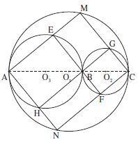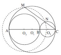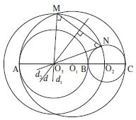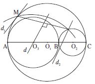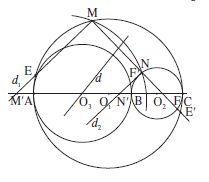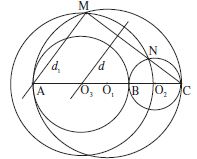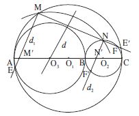 Un cercle $C$ de centre $O_3$ intersecte les cercles $C_1$ et $C_2$ aux points M et N situés d’un même côté par rapport à la droite des diamètres communs AC. La médiatrice d de la corde MN passe par le point $O_3$ : les perpendiculaires $d_1, d_2$ menées des points M, N respectivement au segment MN comprennent entre elles le point $O_3$. Si elles coupent la droite AC aux points M’ et N’ respectivement, le point $O_3$ est milieu du segment M’N’ et le point M’ est situé sur la demi-droite $O_3A$ d’origine $O_3$.
