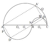 Ainsi la droite MN recoupe l’arc $\overset{\frown}{BNC}$ au point F, et la droite $d_2$ recoupe le cercle $C_2$ au point F’ diamétralement opposé : le point N’ est situé sur le segment BC.