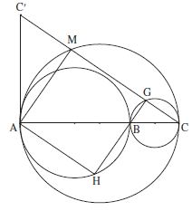 La construction du point M est alors la suivante : élever du point A la perpendiculaire à AC et, sur cette perpendiculaire, reporter le point C’ tel que AC’ = AB. La droite CC’ recoupe le cercle de diamètre AC au point M cherché :