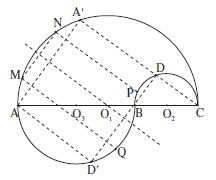 Le point P est situé sur l’arc de $C_1$ définissant la courbe et dans le même demi-plan défini par la droite A’C que le point N. La droite NP étant parallèle à la droite A’C, le point P est situé sur l’arc $\overset{\frown}{AA’}$ .