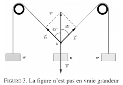 Exercice préliminaire 2. La figure 3 représente un fil qui passe par deux poulies. On fixe une masse M sur ce fil. On accroche aussi deux masses identiques M’ aux extrémités du fil. L’ensemble est immobile. Le système est en équilibre. On note $\vec f_1$ et $\vec f_2$ les forces exercées par les deux masses M’ en A, et $\vec p$ la force exercée par la masse M en A.