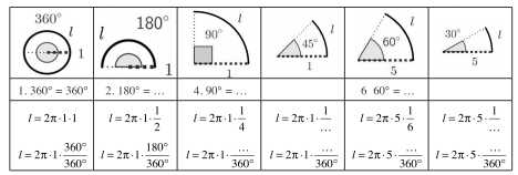 modélisation. L’exercice précédent peut servir à motiver l’introduction de l’unité radian : on voit que pour un cercle de rayon 1, la détermination de la longueur d’un arc se fait naturellement à partir de fractions de $\pi$ plutôt qu’avec des degrés.