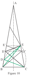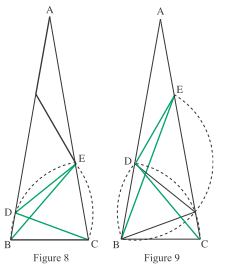 La première paire coïncide avec les deux généralisations du triangle d’or, pour $\alpha$ = 20° ; en effet pour le n°1, les deux triangles BCD et BCE sont isocèles (fig. 8) et pour le n°2, le triangle BCE est isocèle et (CD’) est bissectrice de l’angle C, en désignant par D’ la position de D dans ce cas là.