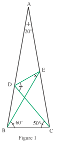 Soit ABC un triangle isocèle d’angle au sommet 20°. On trace (BE) et (CD) faisant des angles de 60° et 50° respectivement avec la base (BC). Calculer les angles $\widehat{CDE}$ et $\widehat{DEB}$.