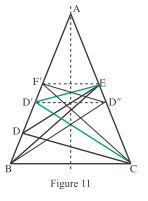 Désignons par D’’ et E’ les symétriques de D’ et E par rapport à la médiatrice de [BC]. La figure 10 nous fait conjecturer que (BD’’) est parallèle à (DE) et (D’’E’) parallèle à (CD). Sous cette hypothèse, on a $\varepsilon ’ = \widehat{D’EB}=\widehat{E’EB}-\widehat{E’ED’}=\beta - \gamma$ ; puis, à cause de $\delta ’ + \varepsilon ’ = \beta ’ + \gamma ’, \beta ’ = \beta$ et $\delta ’ = \delta$, on en déduit $\gamma ’ = \beta - \varepsilon$.