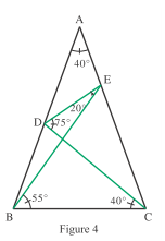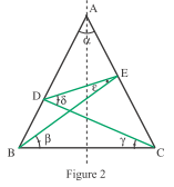 Soit un triangle ABC isocèle en A, avec $\widehat{A}=\alpha$ . On trace (CD) et (BE) avec D sur [AB] et E sur [AC] tels que $\widehat{EBC}=\beta$ et $\widehat{DEB}=\gamma$ (à une symétrie près on peut supposer $\gamma < \beta$ ). Calculer les angles $\widehat{CED}=\delta$ et $\widehat{DEB}=\varepsilon$ (fig.2).