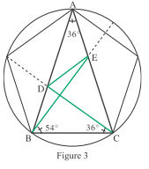 Par ailleurs (CD) est perpendiculaire à (BE), et bissectrice de l’angle $\widehat{C}$. Cela nous donne très rapidement $\varepsilon=\widehat{DEB}=18$° et $\delta=\widehat{EDC}=72$°(fig.3).
